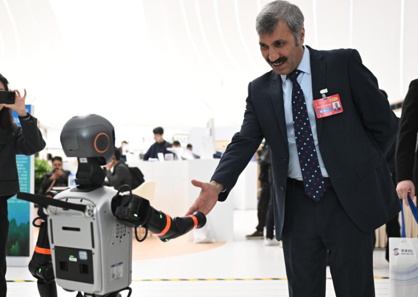 2025中關村論壇年會,與會嘉賓與機器人握手 來源:新華社