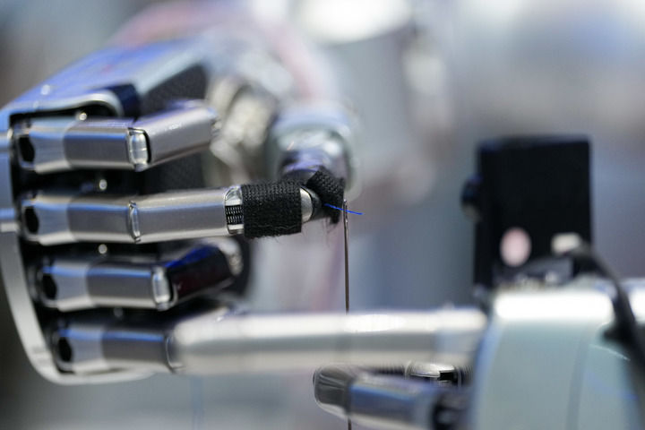 3月24日,在中關(guān)村展示中心常設(shè)展內(nèi),一臺配備了靈巧手的機(jī)器人在展示穿針引線。(鞠煥宗 攝