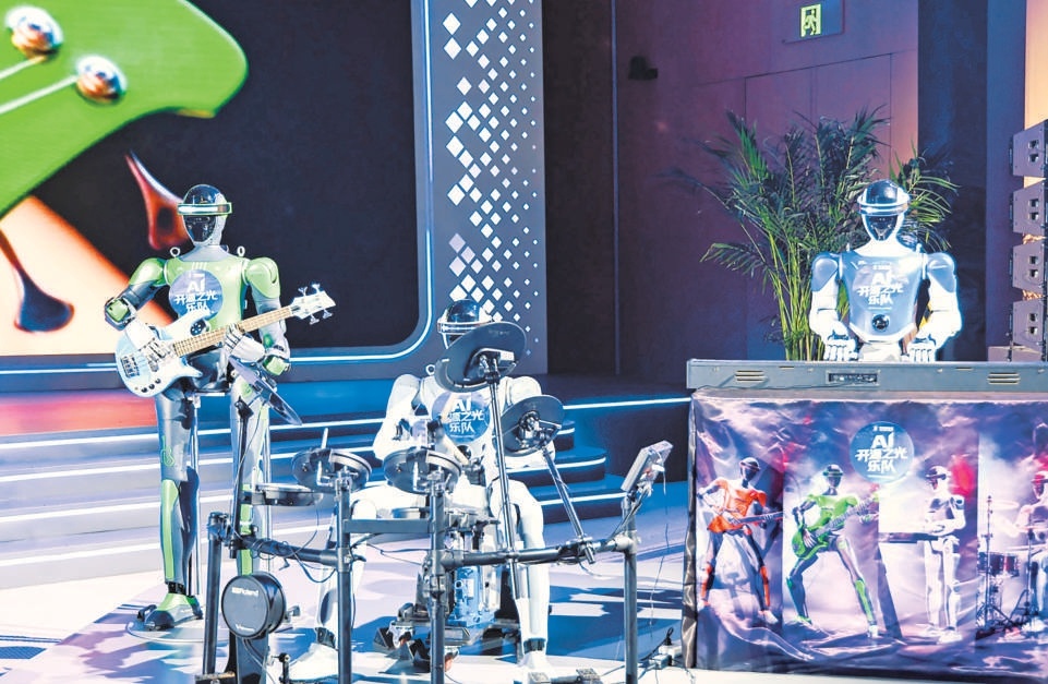 2026中關(guān)村論壇年會(huì)“人工智能主題日”活動(dòng)現(xiàn)場(chǎng),AI開(kāi)源之光樂(lè)隊(duì)的機(jī)器人樂(lè)手演奏了一曲由AIGC創(chuàng)作的歌曲燃爆全場(chǎng)。(和冠欣 攝)