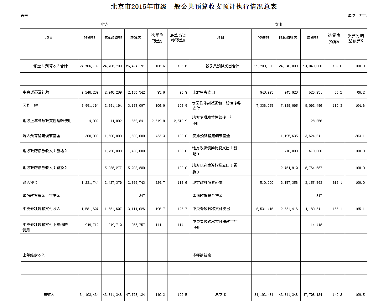 - 附件6:表三北京市2015年市級一般公共預算收支決算情況總表