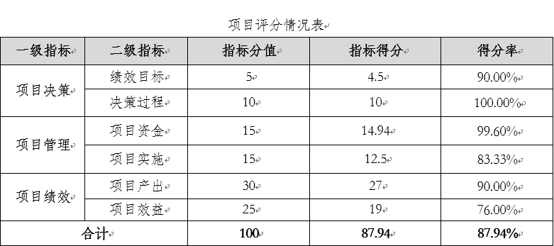 通過評(píng)價(jià),本項(xiàng)目綜合得分為87.94分,項(xiàng)目綜合績(jī)效評(píng)定結(jié)論為“良好”。