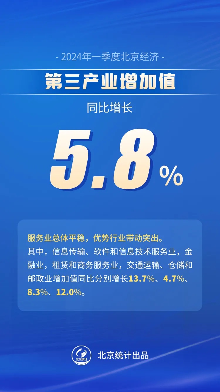 一季度,全市第三產(chǎn)業(yè)增加值按不變價(jià)格計(jì)算,同比增長(zhǎng)5.8%。其中,信息傳輸、軟件和信息技術(shù)服務(wù)業(yè)快速增長(zhǎng),實(shí)現(xiàn)增加值2379.2億元,增長(zhǎng)13.7%;金融業(yè)平穩(wěn)支撐,實(shí)現(xiàn)增加值2197.0億元,增長(zhǎng)4.7%;接觸性行業(yè)繼續(xù)恢復(fù),租賃和商務(wù)服務(wù)業(yè)實(shí)現(xiàn)增加值582.2億元,增長(zhǎng)8.3%;交通運(yùn)輸、倉儲(chǔ)和郵政業(yè)實(shí)現(xiàn)增加值243.8億元,增長(zhǎng)12.0%。