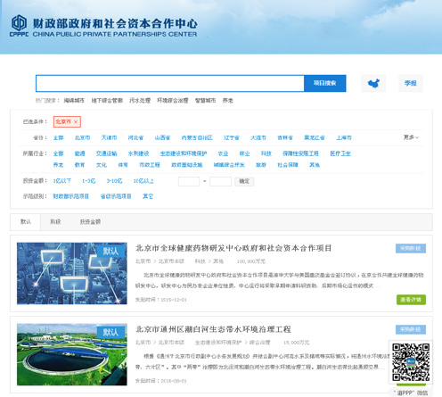 推進政府和社會資本合作項目(PPP)信息公開。分級收集管理市、區(qū)兩級PPP項目信息,跟蹤PPP項目推進情況,建立PPP項目信息報送和管理考核制度。通過政務微博微信發(fā)布《北京:納入財政部PPP示范項目、最高獎補800萬元》、《北京拋"3+5+5"PPP項目大禮包》等政策信息,確保企業(yè)單位及時了解掌握PPP相關政策動態(tài)。