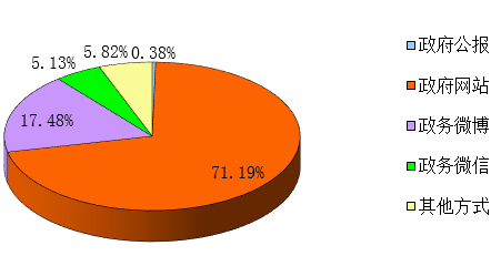 通過不同渠道和方式公開政府信息的情況,其中,通過政府公報公開政府信息4899條,占總數的0.38%;政府網站公開政府信息921908條,占總數的71.19%;政務微博公開政府信息226278,占總數的17.48%;政務微信公開政府信息66479條,占總數的5.13%;其他方式公開政府信息75367條,占總數的5.82%。