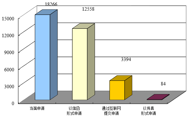 全市申請總數為34200件。申請方式中,當面申請18266件,占總數的53.25%;以傳真形式申請84件,占總數的0.24%;通過網絡提交申請3394件,占總數的9.89%;以信函形式申請12558件,占總數的36.62%。(因同一申請可以多種申請方式提出,故分類申請之和大于申請總數。)