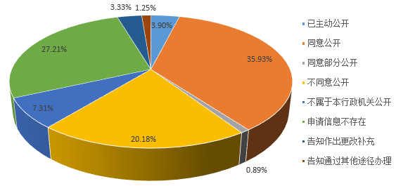 已答復的33149件申請中,"屬于已主動公開范圍"1293件,占總數的3.90%;"同意公開"11909件,占總數的35.93%;"同意部分公開"296件,占總數的0.89%。