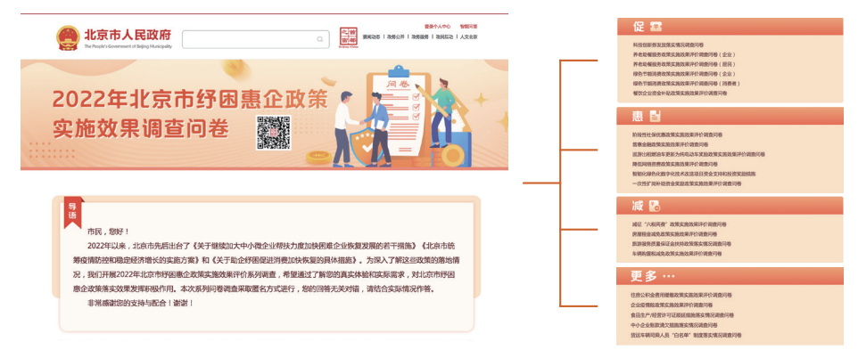 市政府門戶網(wǎng)站和微信公眾號(hào)上線“2022年北京市紓困惠企政策實(shí)施效果調(diào)查問卷”專題,開展社會(huì)評議。政府信息公開法定要求納入績效考核指標(biāo)和第三方評估體系,年度內(nèi)未發(fā)生需責(zé)任追究情形。