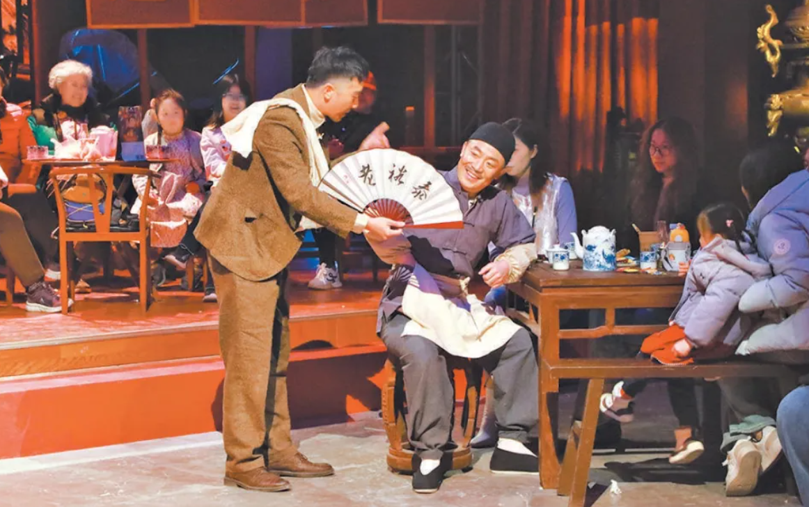 將視線轉(zhuǎn)向繁華的王府井大街,同樣別開生面的場景正在舍予劇場上演。作為北京市曲劇團(tuán)駐演的全新空間,這里上演的沉浸式北京曲劇《京城拍賣會》,在老北京茶樓的氛圍中牢牢抓住了觀眾的心。觀眾換取的“銅板”是拍賣會的籌碼,也是解鎖劇情的關(guān)鍵道具。弦聲起,板鼓聲落,老舍筆下的京味人物次第登場,觀眾在競拍老物件的歡聲笑語中,品味著老北京的人情冷暖與悲歡離合。