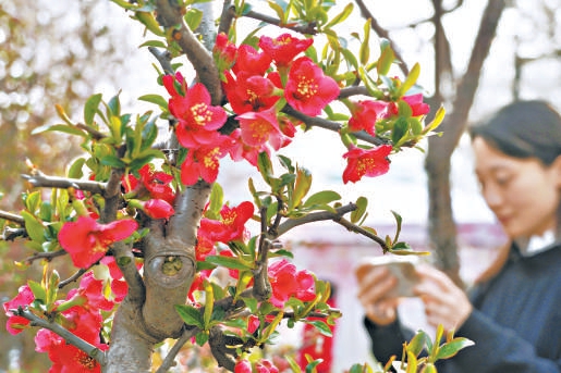 綻放的海棠花吸引游客欣賞、拍攝。(程功 攝)