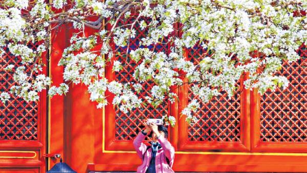 智化寺內(nèi),古梨樹(shù)雪白梨花如雪瀑傾瀉,與古剎紅墻相映成趣。