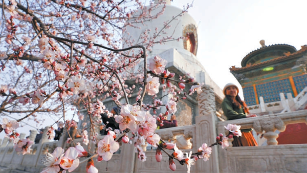 北海公園瓊華島的山桃與白塔形成經典畫卷。