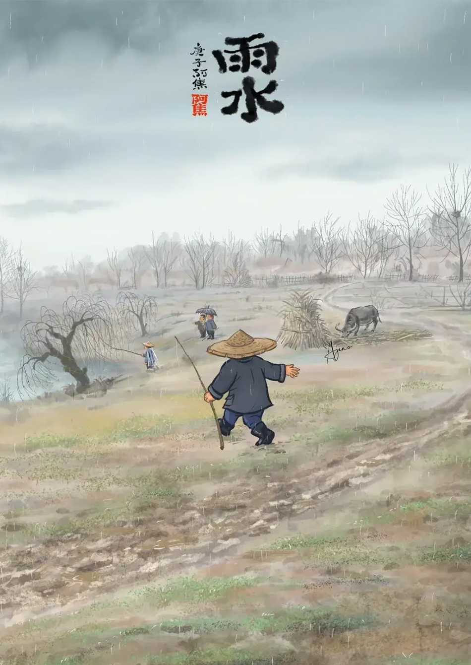 俗話說“春雨貴如油”萬物復(fù)蘇,春天真的到了,古人說:“東風(fēng)解凍,冰雪皆散而為水,化而為雨,故名雨水?!痹谡€寒之時(shí),抽青早的草木格外受到人們的青睞,畢竟物以稀為貴,待到萬紫千紅之時(shí),大家?guī)缀跻呀?jīng)審美疲勞了。柳梢頭若有若無的一抹新綠,便是殘冬早春時(shí)節(jié)人們的視覺盛宴。民間雨水節(jié)氣還保留有接壽、回娘屋、撞拜寄等習(xí)俗。(作者:賢二水墨)