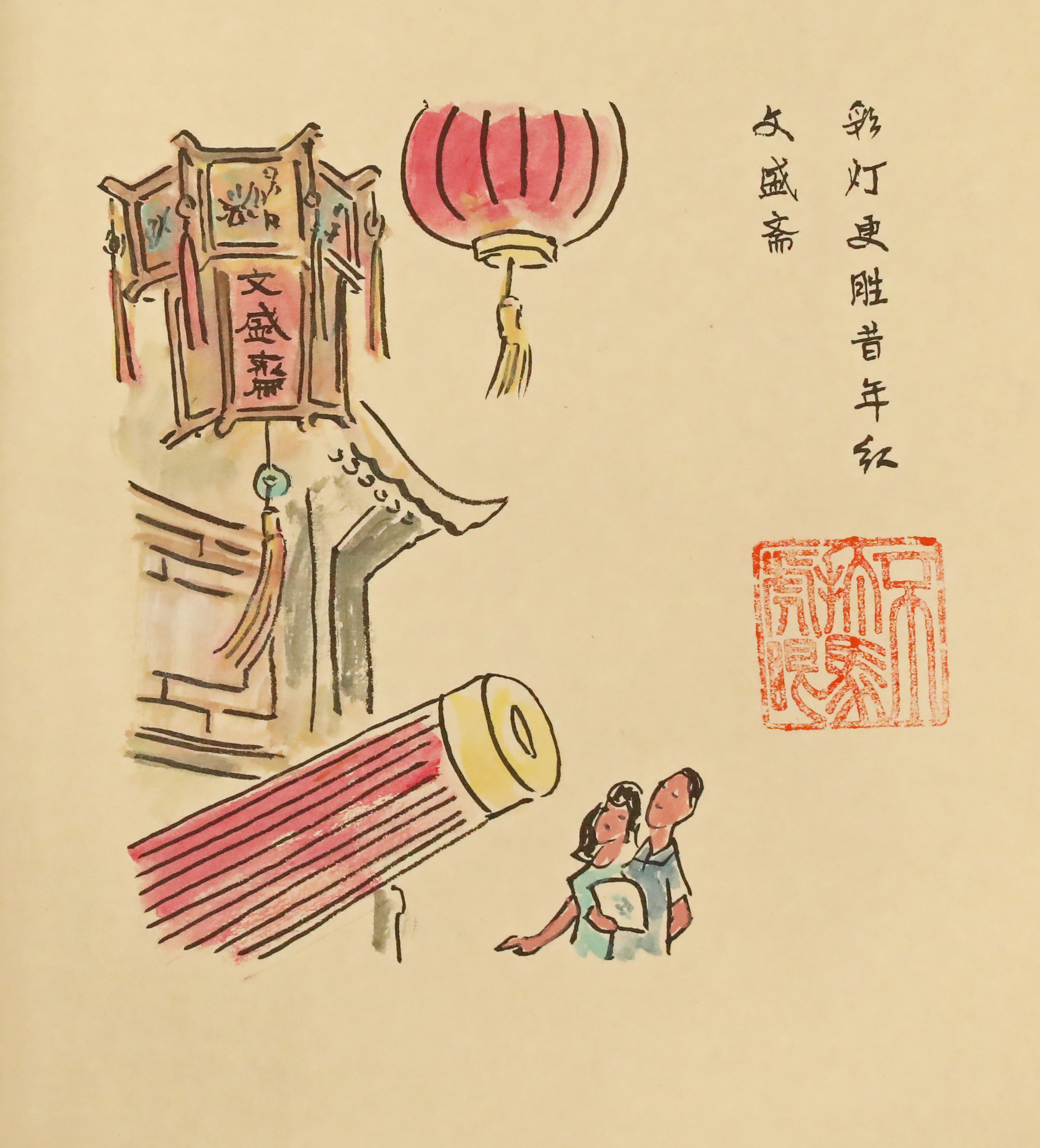 創(chuàng)辦于清嘉慶年間,位于前門外廊房頭條,是自產(chǎn)自銷燈畫扇的老字號商店,其燈彩馳名京華。(作者:李濱聲、陳惠展)