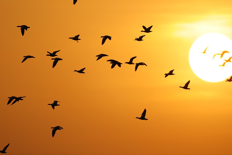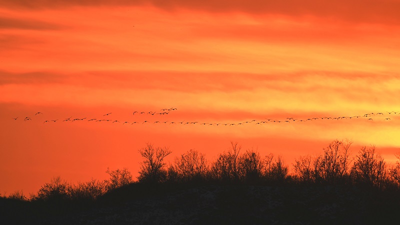 太陽已經(jīng)下山,余暉映紅半邊天,一行短嘴豆雁飛在紅霞中。(攝影:李愛宏)