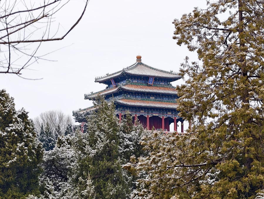 馬年的第一場雪悄然而至。銀絮紛揚中,景山萬春亭化身最佳觀景臺。南望紫禁城紅墻覆雪,東觀現(xiàn)代樓宇披上素紗,古今對話于漫天飛雪間悄然展開。(攝影:李夢嵐 劉鑫雨)
