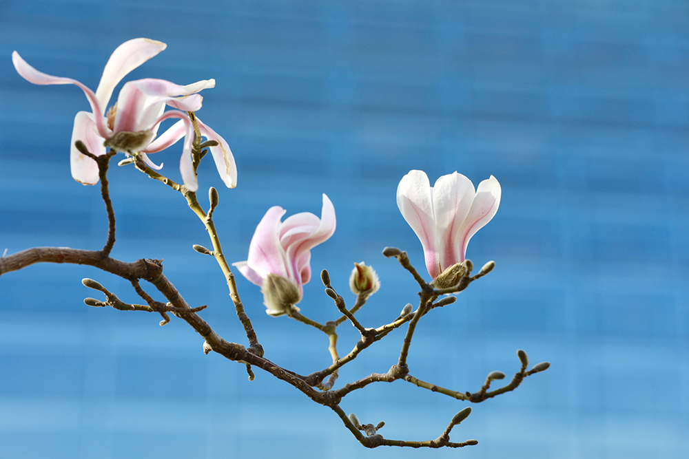 玉蘭為木蘭科落葉喬木,別名白玉蘭、望春、玉蘭花 。花白色到淡紫紅色,大型、芳香,花冠杯狀,花先開放,葉子后長,花期10天左右,中國著名的花木。(攝影:周逸君)