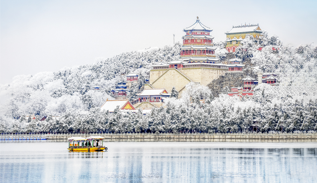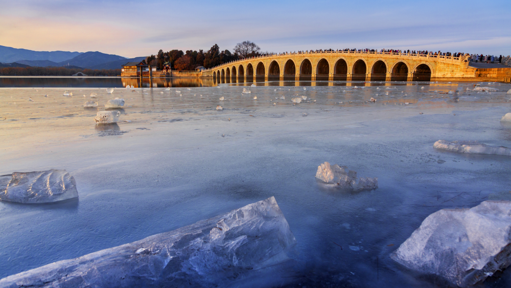 昆明湖面覆蓋著厚厚一層堅冰, 如玉冰心, 西山與浮云相交于遙遠(yuǎn)天際,憑添詩意無限。 冬天的頤和園,有著獨(dú)特的魅力。