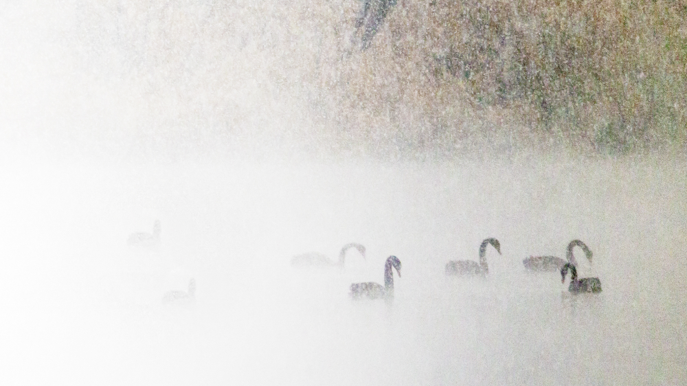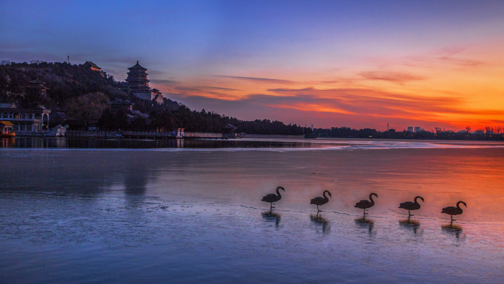 “這里是北京,……”是的,昆明湖上,一字排列的黑天鵝們,也跟您一樣,正在聆聽《北京你早》的晨曲。