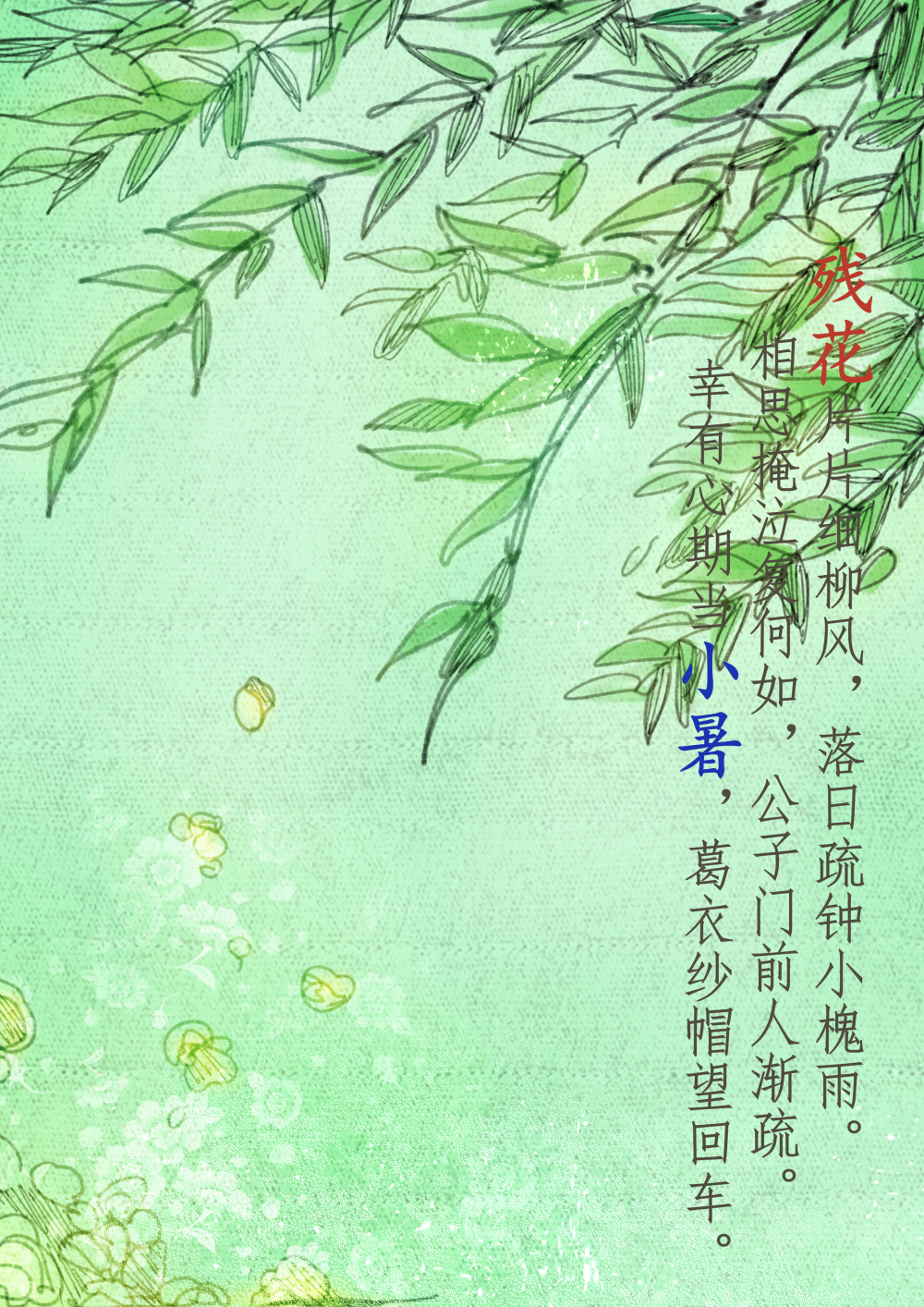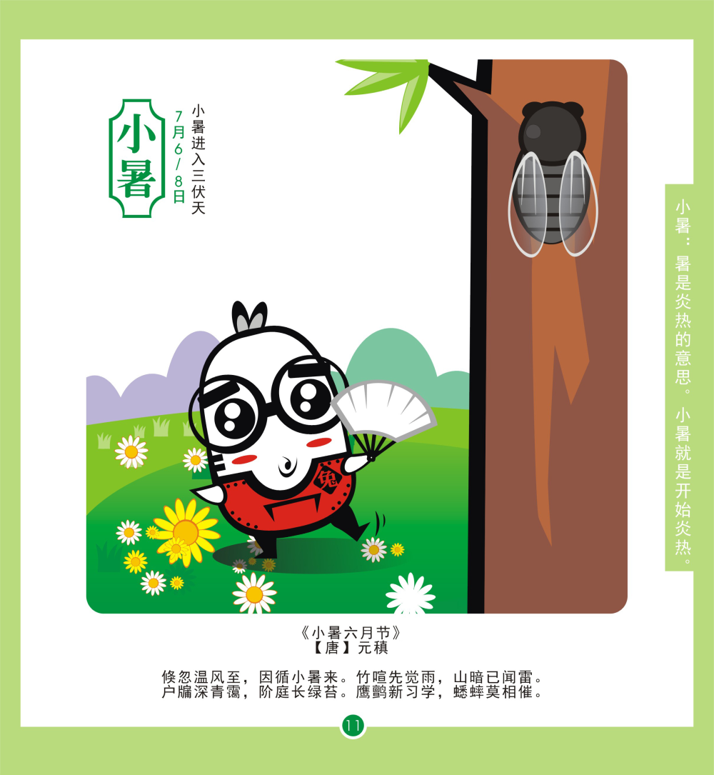 每年7月7日或8日視太陽到達(dá)黃經(jīng)105°時(shí)為小暑。是夏天第五個(gè)節(jié)氣。民間有“食新”、“吃餃子”、“吃炒面”等習(xí)俗。(作者:李佳霖)