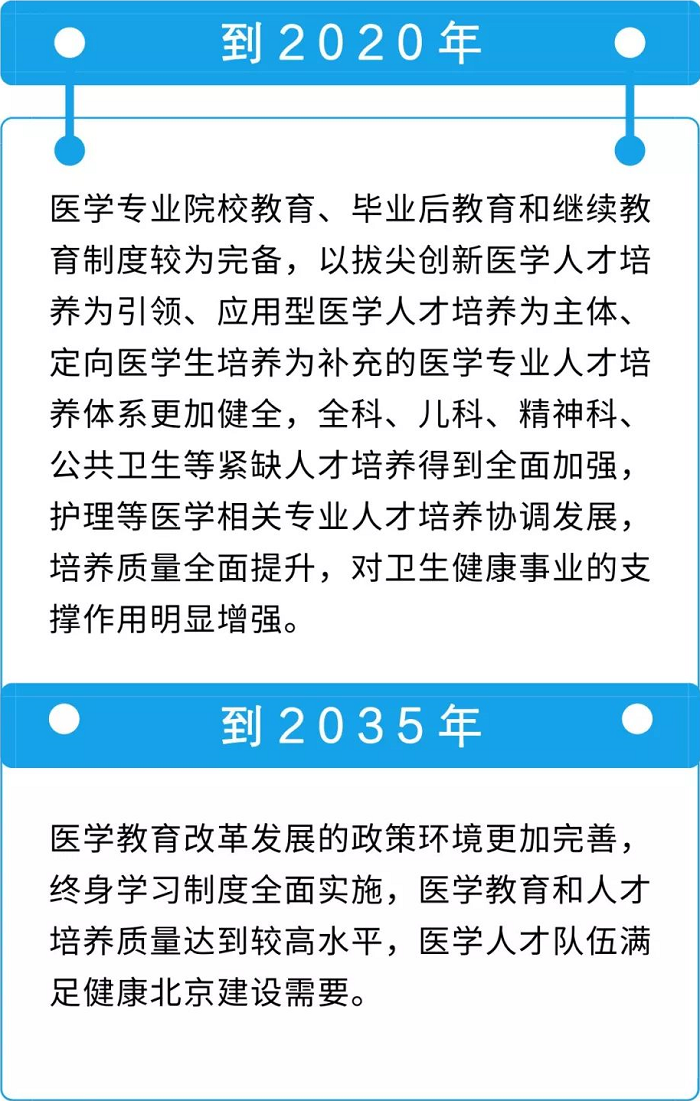 《實施方案》明確了2020年和2035年北京市醫(yī)學(xué)教育改革發(fā)展的工作目標(biāo),提出:
