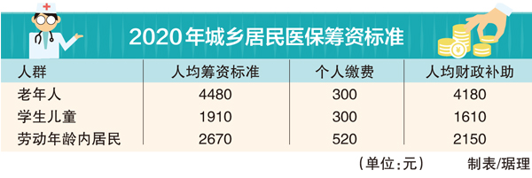 2020年城鄉(xiāng)居民老年人人均籌資標(biāo)準(zhǔn)為4480元/年,其中,個人繳費300元/年,財政人均補助4180元/年;學(xué)生兒童人均籌資標(biāo)準(zhǔn)1910元/年,其中,個人繳費300元/年,財政人均補助1610元/年;勞動年齡內(nèi)居民人均籌資標(biāo)準(zhǔn)2670元/年,其中,個人繳費520元/年,財政人均補助2150元/年。參保個人須按新的繳費標(biāo)準(zhǔn)在扣款賬戶中存有足額存款,確保能如時扣款完成參保繳費。